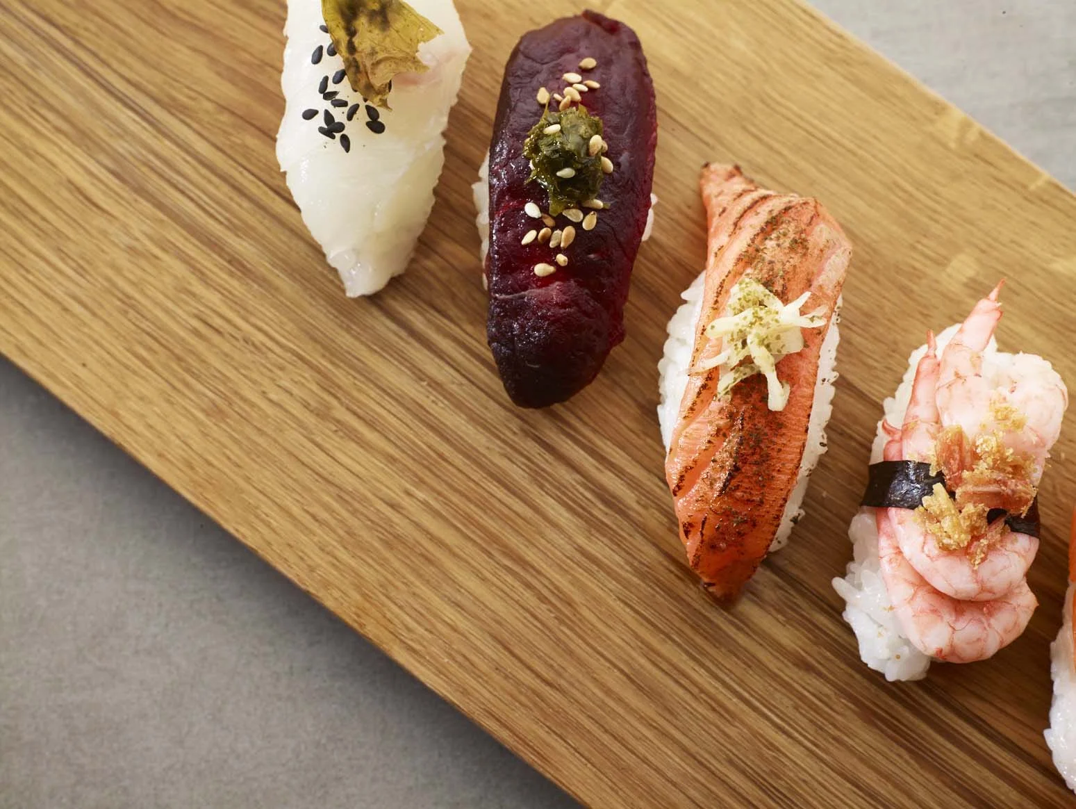 - Nigiri med hval, butare og ristede sesamfrø